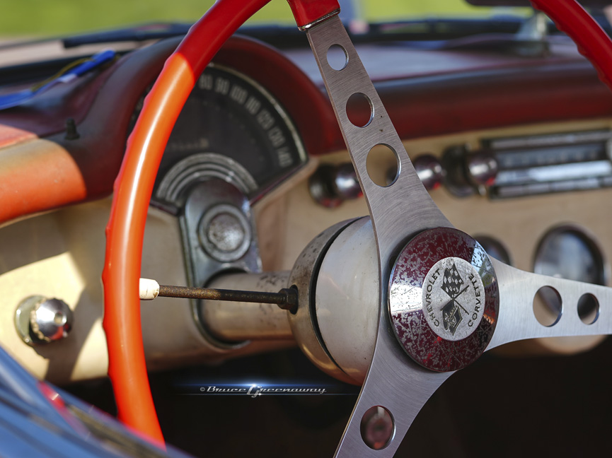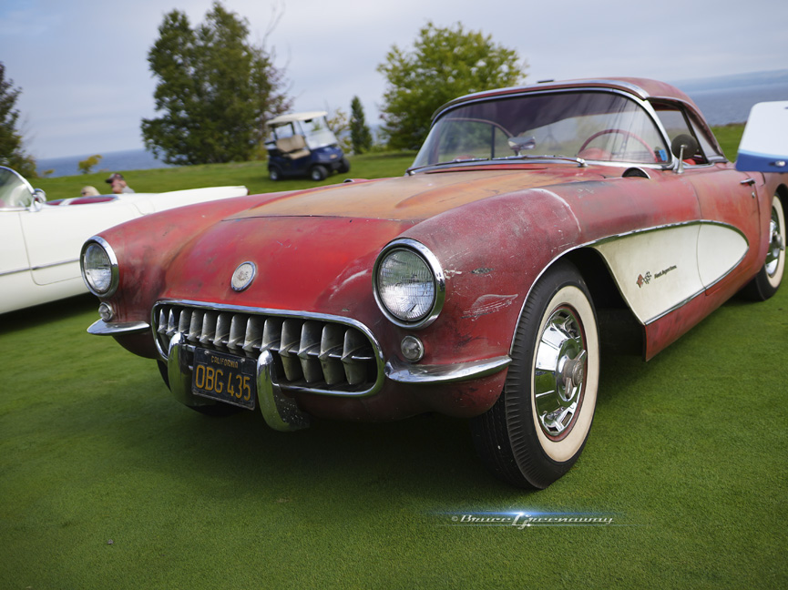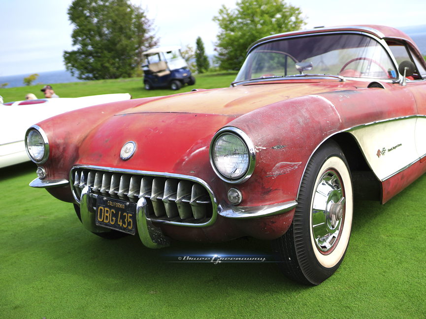 …case in point, this barn fresh 1957 Corvette Fuelie. Originally from California, discovered left to rot under a tarp in Michigan (after a stint of Detroit drag racing sometime in it’s not too distant past), now resides in Erin ON of all places, and is being preserved in it’s original form… sweaty.