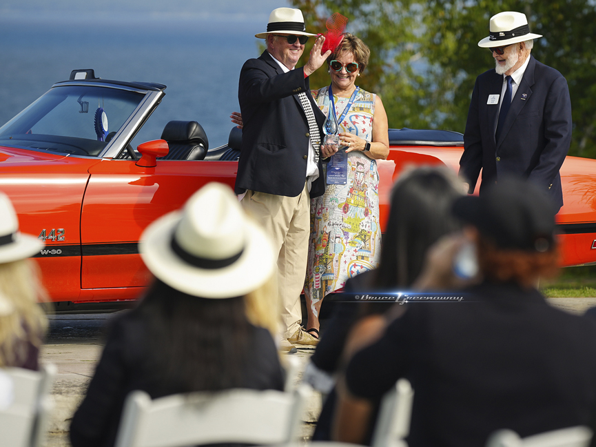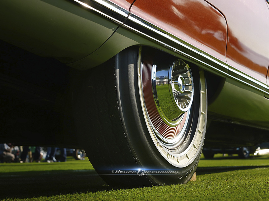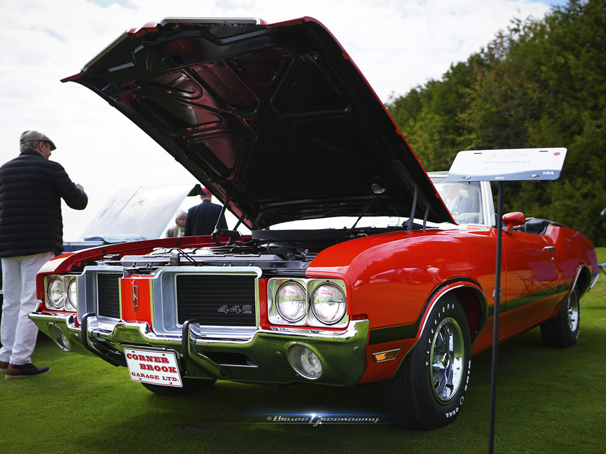 …although Concept Cars are Mustard Report’s favourite Class (as mentioned in previous Cobble Beach Concours Reports over the years), being a 1967 Plymouth Barracuda owner, the “American Performance – Post War” Class is a comfortable category, and seeing the [above], pristine, sublime green, 3rd Gen ‘Cuda, resting on those stylish Goodyear Polyglas tires, right beside a killer, neon orange, 1971 442 drop-top [below], resting on a set of just as stylish Firestone Wide Ovals… well, Mustard simply had to take a moment.