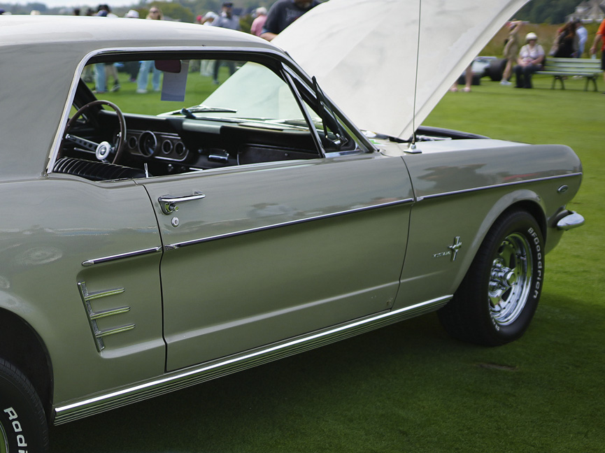 Among the cars in this Class, there was a ’66 Mustang, no biggy right?, not rare in the collector world, but, upon closer inspection, Mustard spotted something a little atypical, this Mustang had what appeared to be, “factory side trim”, huh? Knowing a little something about trim, how hard (and expensive) it is to get for these old cars, it prompted a closer inspection, which led to a conversation with the ‘under 30’ owner…